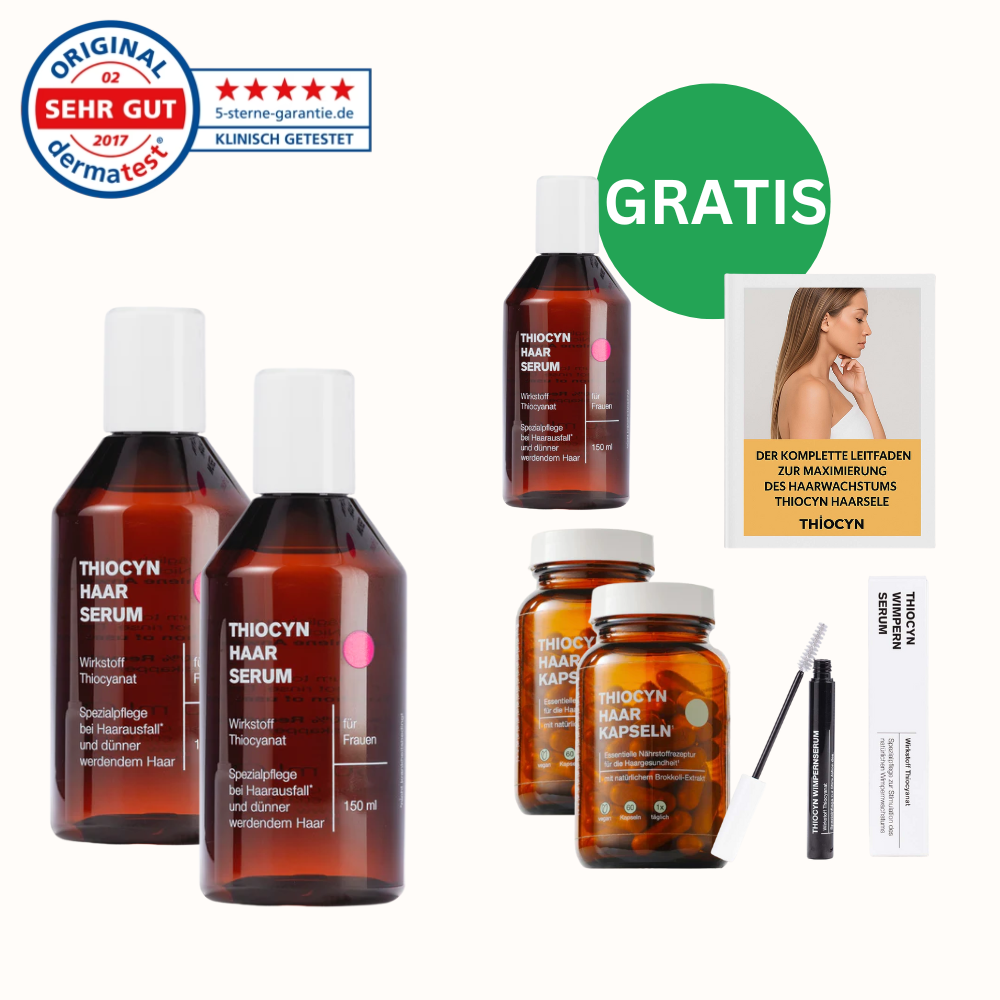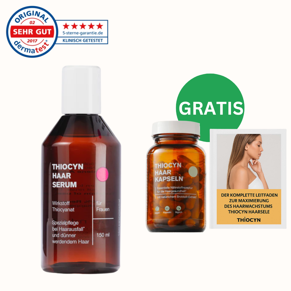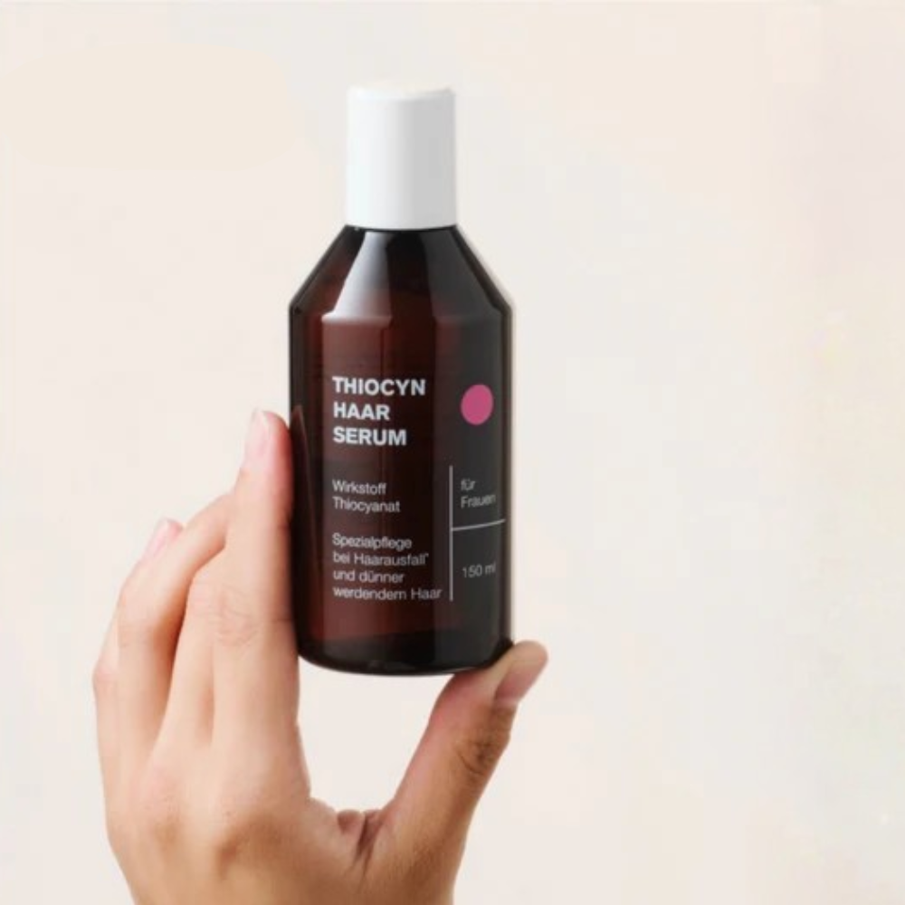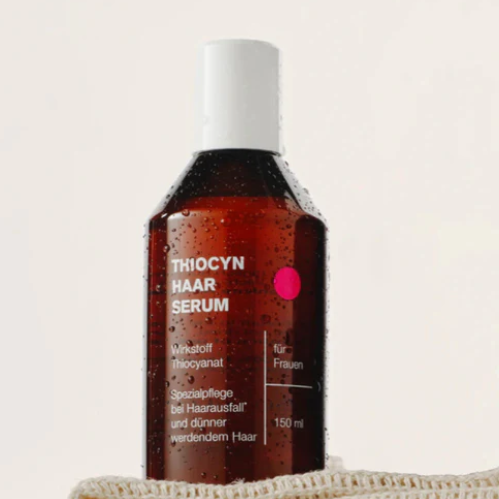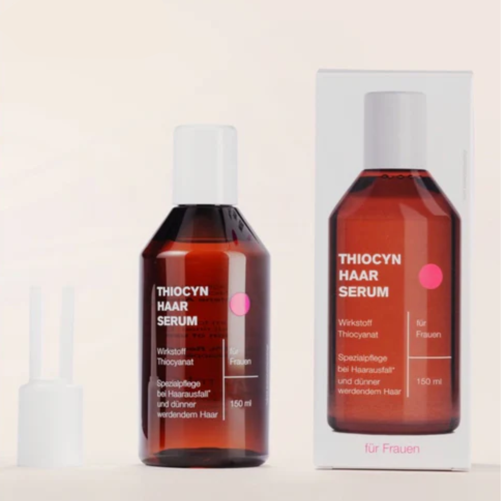 Der körpereigene Wirkstoff Thiocyanat ist von essenzieller Bedeutung für den Zellstoffwechsel und somit auch wichtig für das Haarwachstum. Thiocyn Haarserum entlastet mit seinem patentierten Thiocyanat-Wirkkomplex die Haarwurzel, versorgt sie und aktiviert den Zellstoffwechsel unspezifisch. Die Haarwurzeln werden gestärkt und dadurch gegen eine Vielzahl wachstumsstörender Einflüsse geschützt.