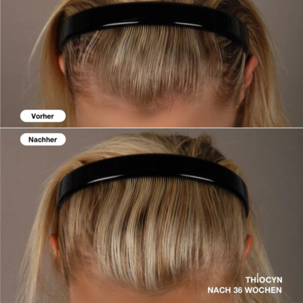 Durch die Reaktivierung des verlangsamten, aus dem Gleichgewicht geratenen Haarzyklus kann es 2-6 Wochen nach Behandlungsbeginn zu einem vermehrten Ausfallen sogenannter telogener, nicht mehr aktiver Haare kommen. Dies ist grundsätzlich ein sehr gutes Zeichen, nämlich dass Sie auf die Behandlung mit Thiocyn Haarserum ansprechen und Platz für neue, kräftigere Haare geschaffen wird. Lassen Sie sich daher durch eine vorübergehende Zunahme des Haarausfalls* nicht entmutigen. Innerhalb weniger Wochen können Sie bereits mit verstärktem Nachwachsen neuer anagener Haare belohnt werden.